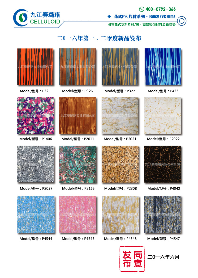 九江賽璐珞實(shí)業(yè)有限公司2016年第一、二季度賽璐珞板材、瑪瑙膜、理石膜、樂(lè)器裝飾材料、花式PVC片材新品發(fā)布,引領(lǐng)花式塑料片材/膜·高端裝飾材料最新趨勢(shì)。咨詢(xún)熱線(xiàn):0792-2838668 / 2838666 / 2835999。