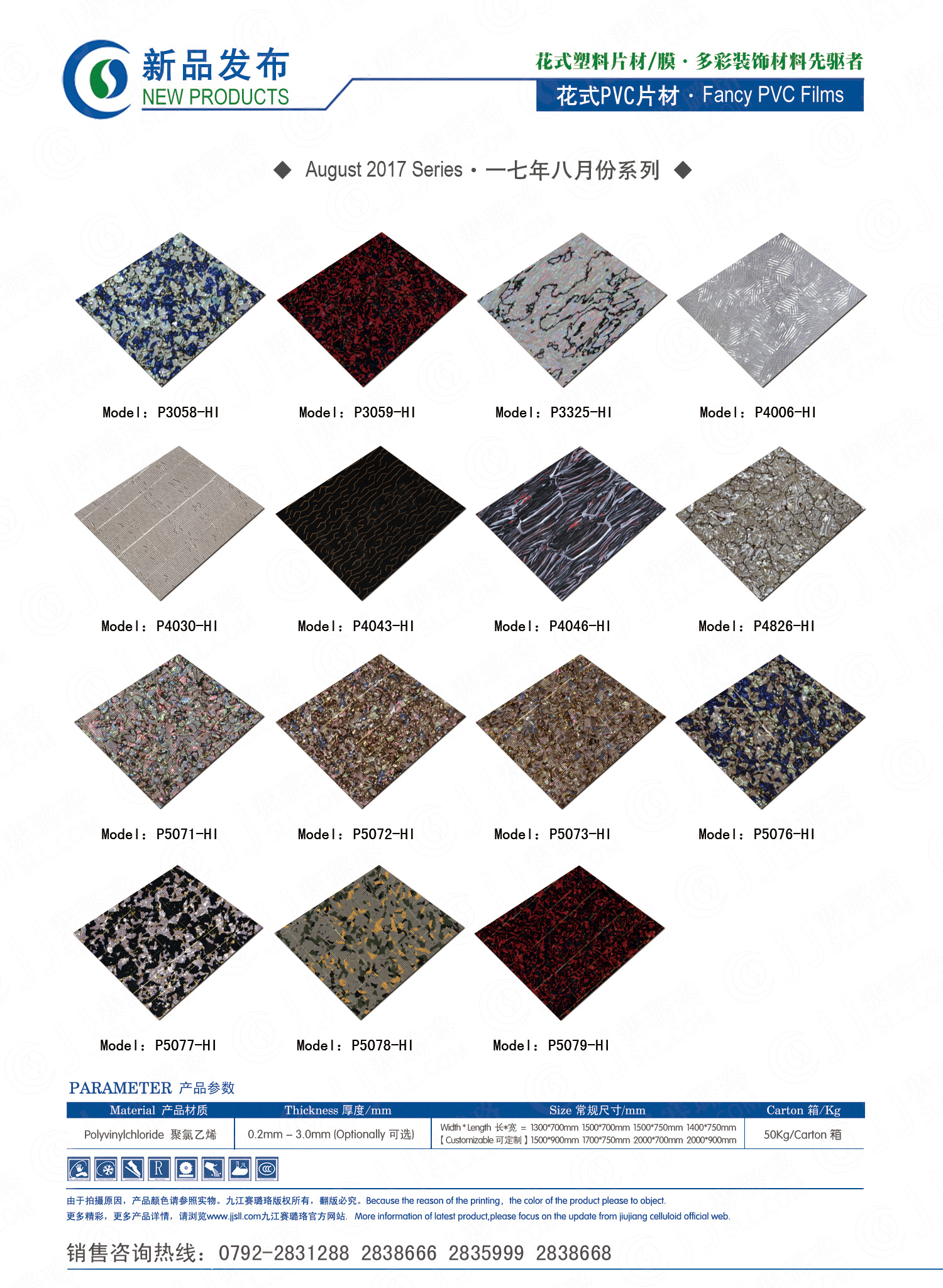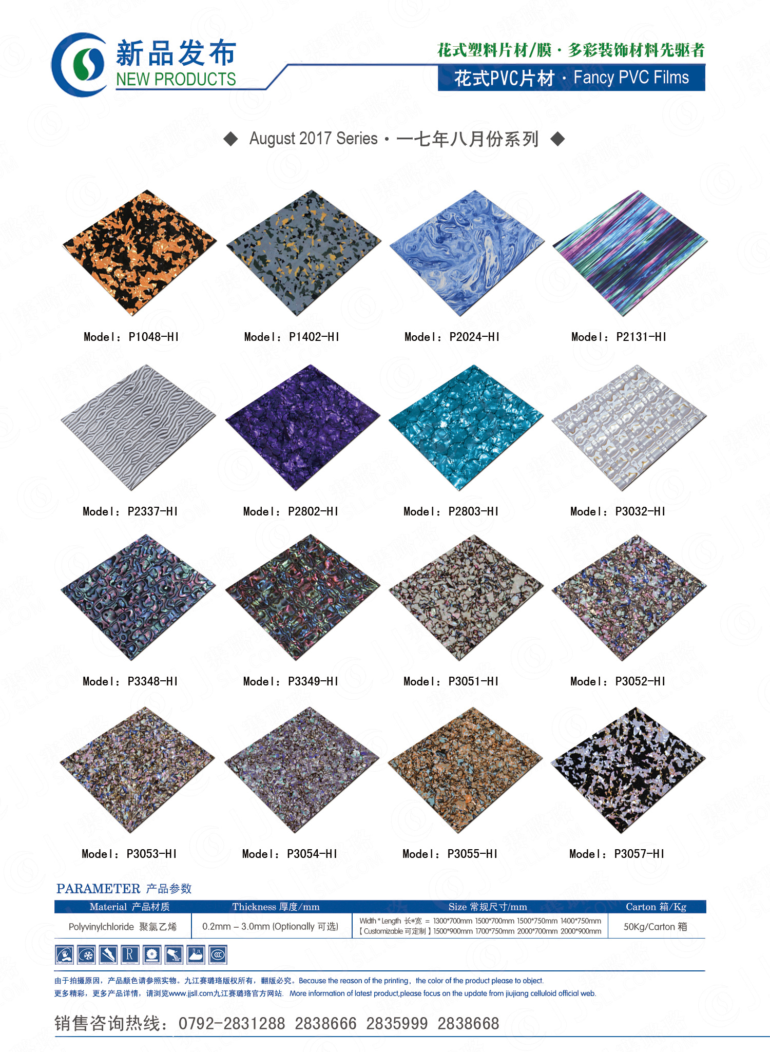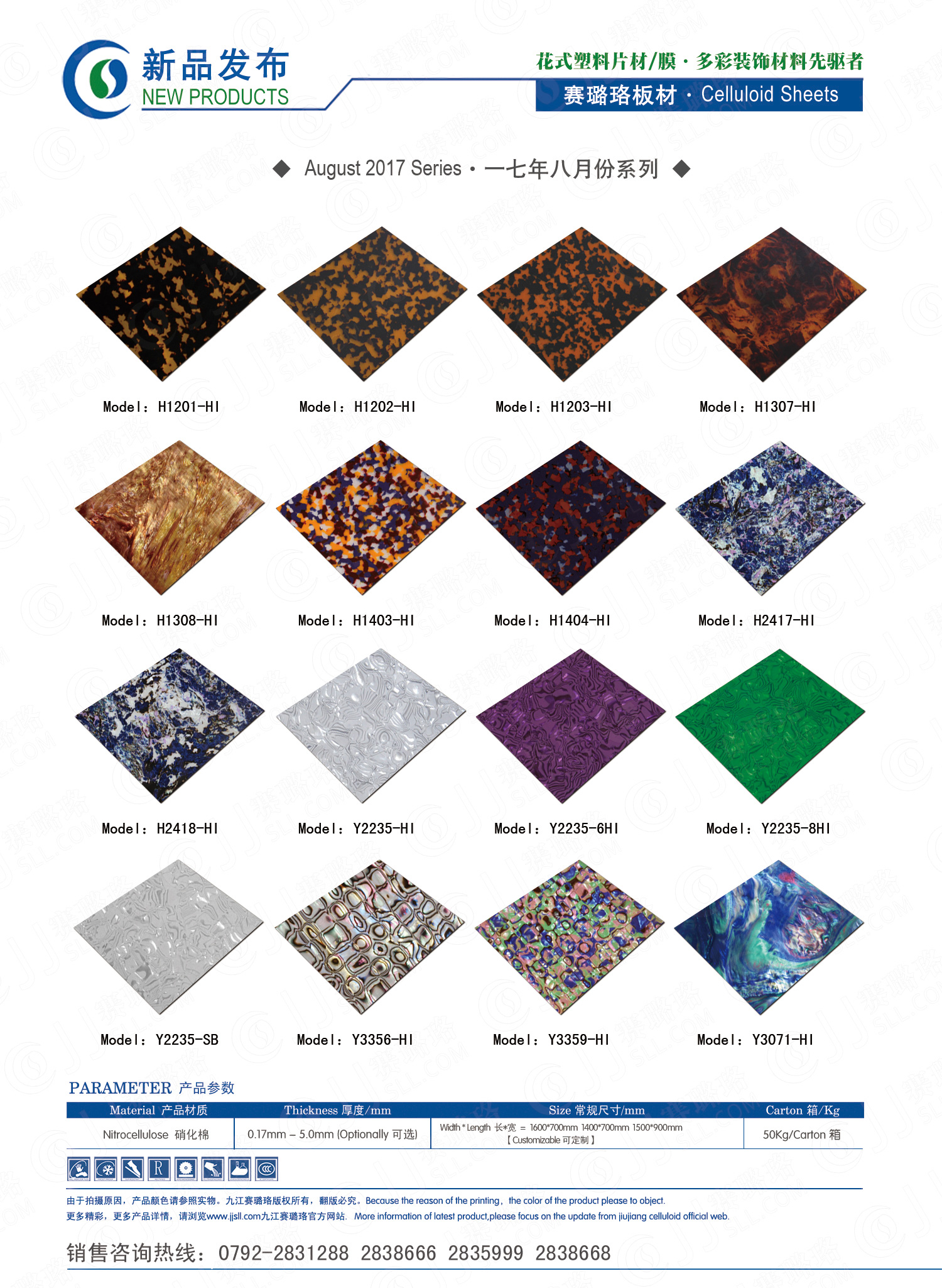 九江賽璐珞實業(yè)有限公司2017年八月份賽璐珞板材、瑪瑙膜、理石膜、樂器裝飾材料、花式PVC片材新品發(fā)布,花式塑料片材/膜·多彩裝飾材料先驅者。咨詢熱線:0792-2838668 / 2831288 / 2838666 / 2835999。點擊圖片查看詳細產品